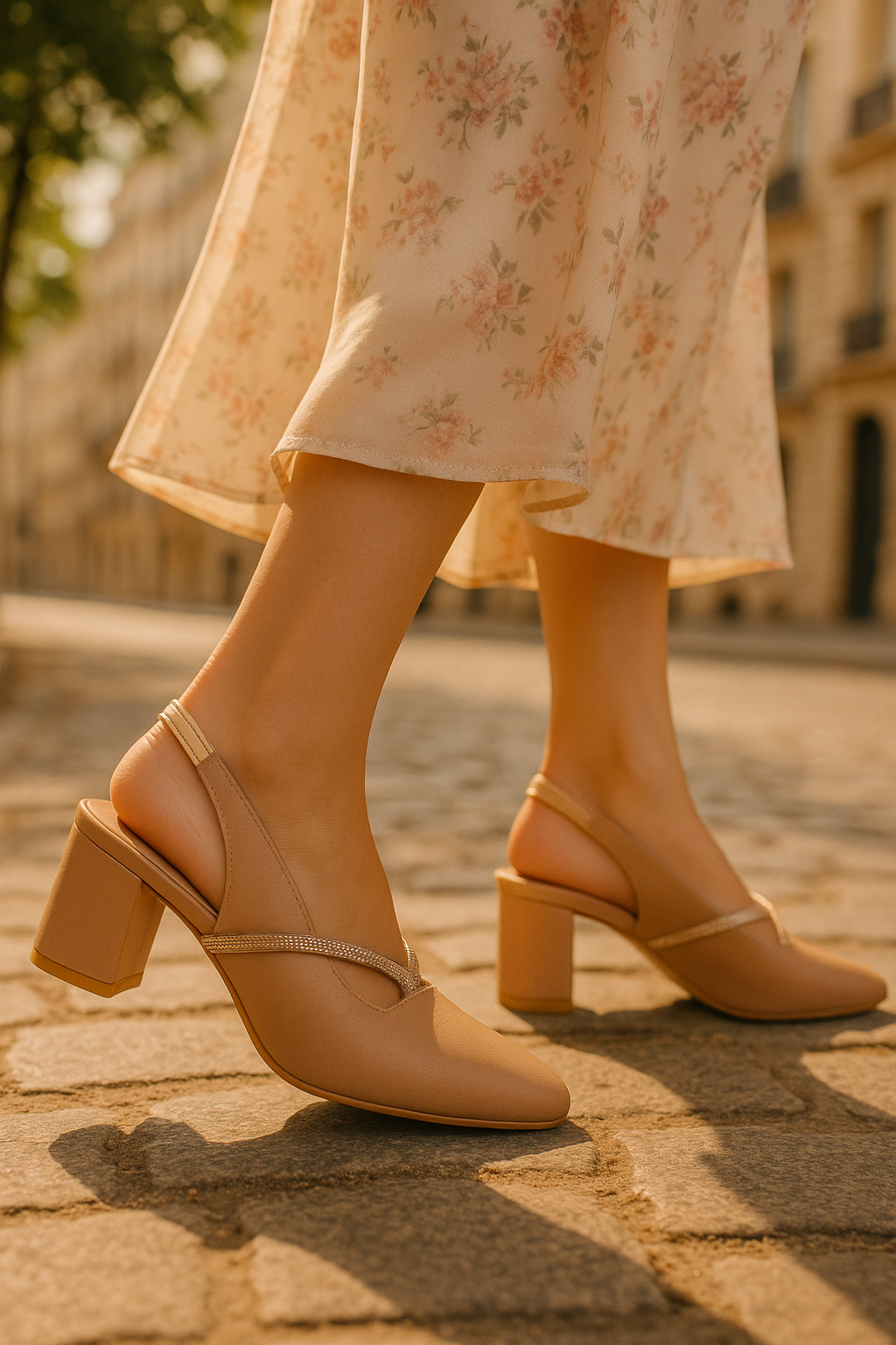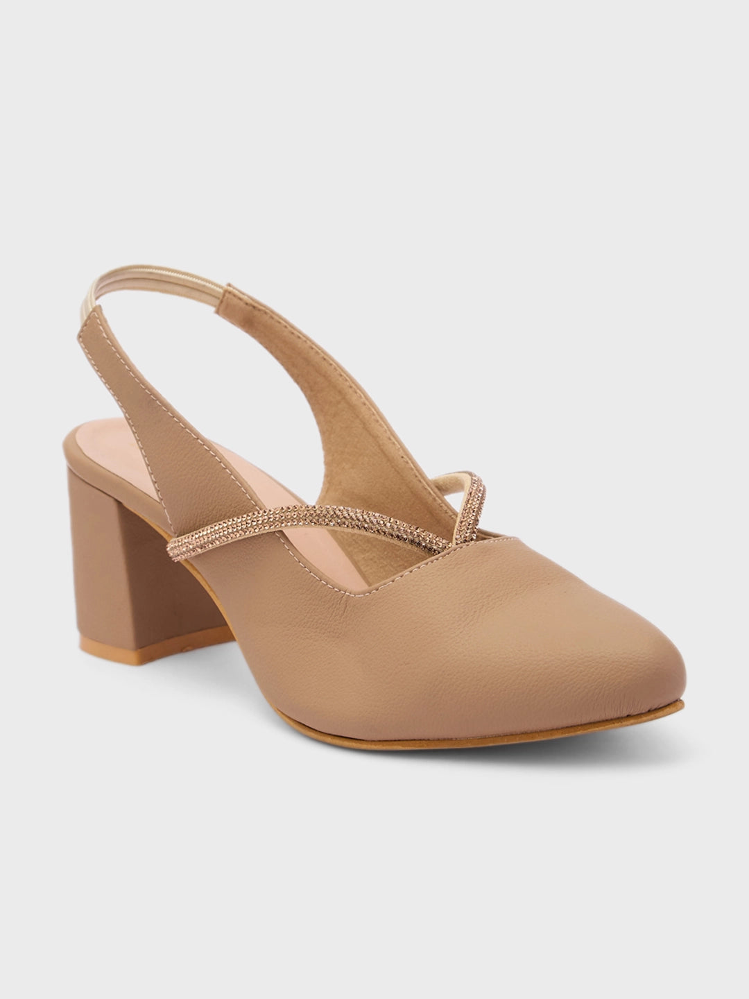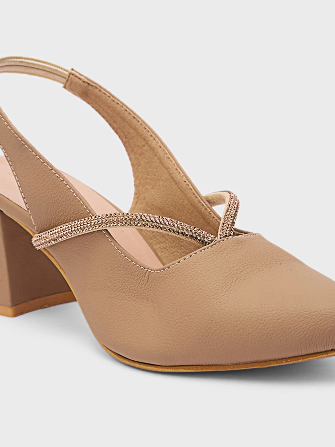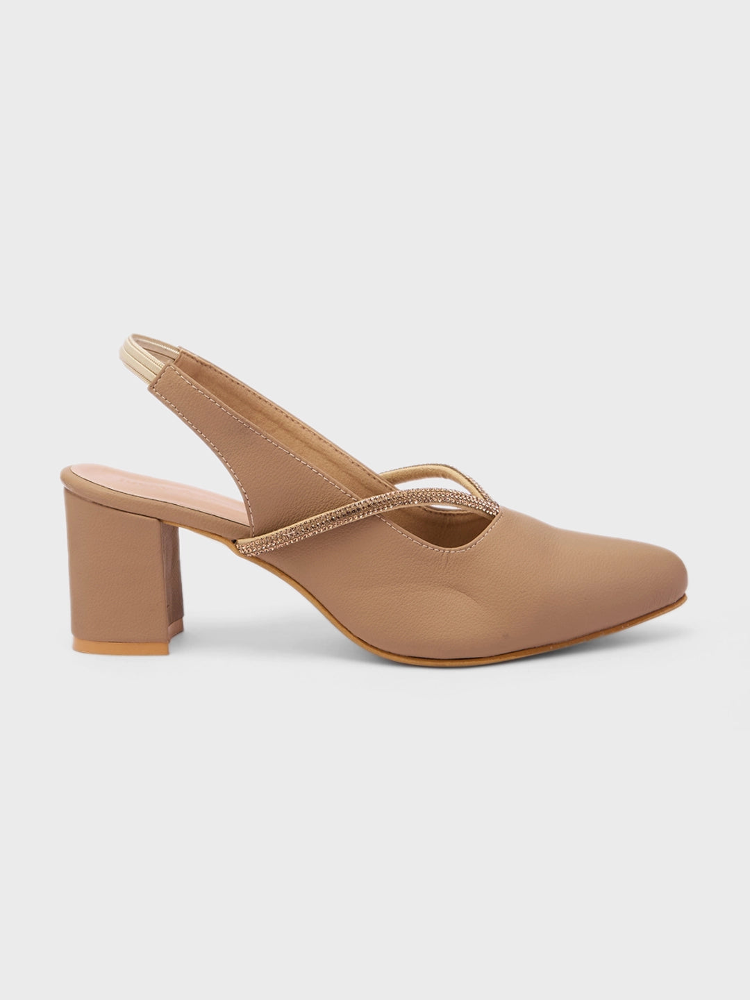 Add a touch of sparkle to your look with these elegant slingback block heels. Featuring a sophisticated pointed toe and a comfortable block heel, these shoes are perfect for both formal and semi-formal occasions. The delicate glitter detailing along the straps adds a touch of glamour, while the neutral beige hue ensures versatility. The slingback design provides a secure fit, and the low block heel offers comfort for all-day or evening wear. These heels are designed to elevate your style with their refined silhouette and subtle shimmer.