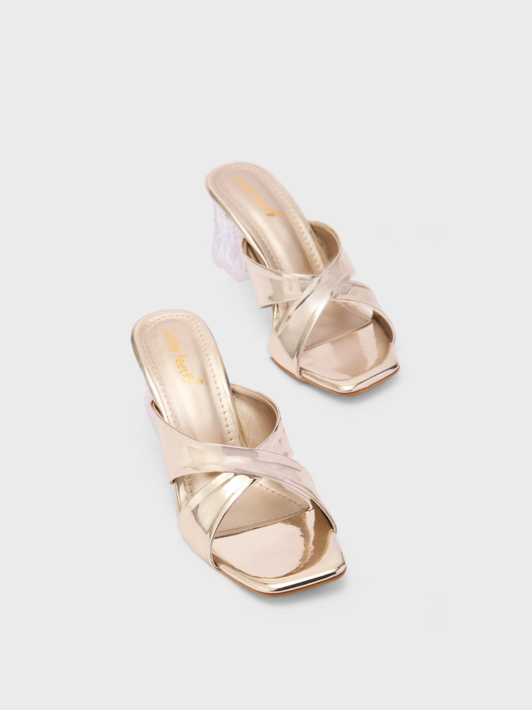 Step into glamour with these stunning block heels featuring shiny metallic cross straps. The lustrous gold finish adds a touch of sophistication, making them perfect for special occasions and evening events. The crisscross design provides a secure and stylish fit, while the comfortable block heel offers a subtle lift without compromising on comfort. The open back design allows for easy slip-on convenience. These heels are designed to elevate your look with their modern silhouette and eye-catching metallic shine.